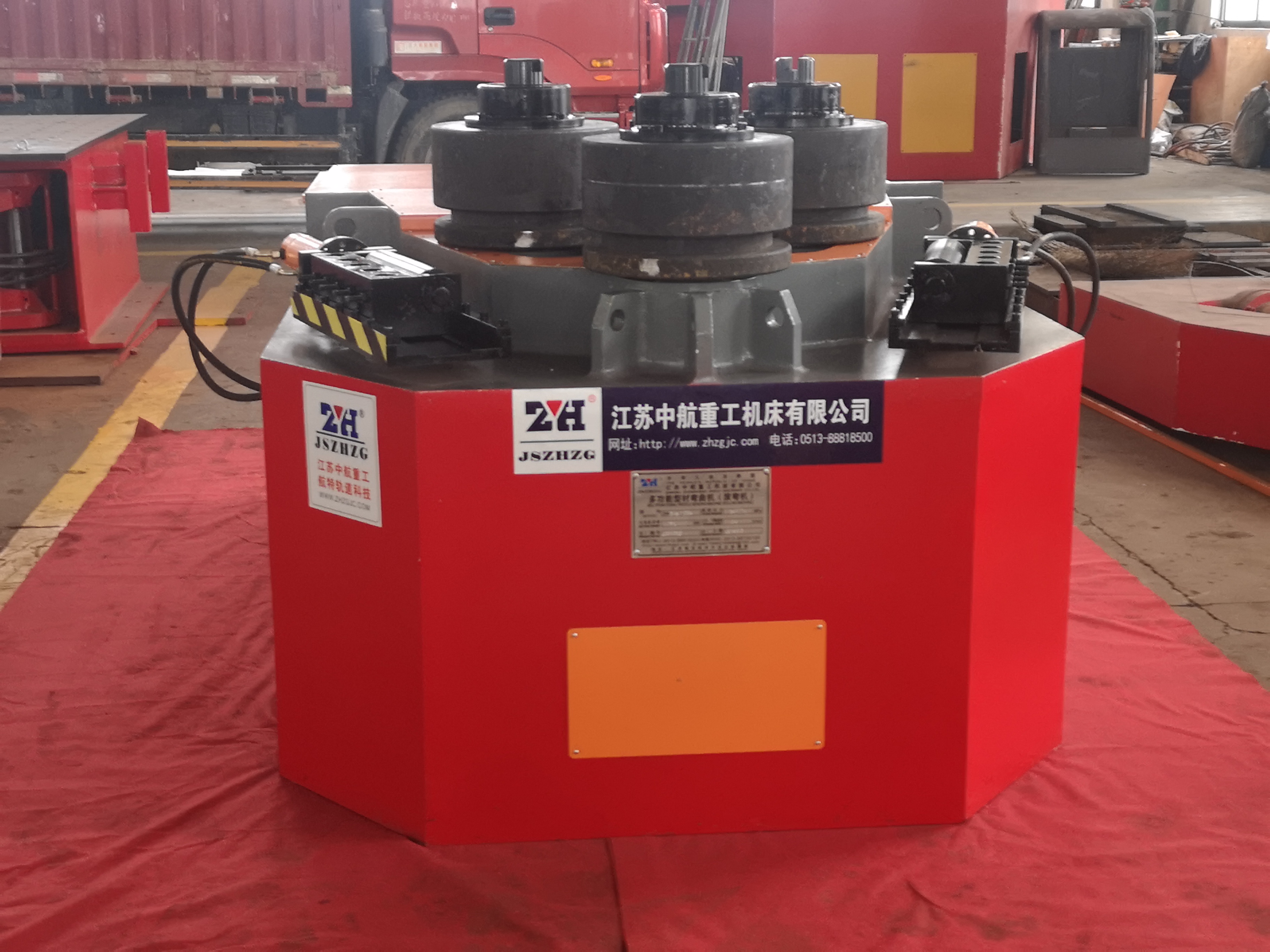 型材彎曲機在進行卷板工作時,上輥位置固定不動,下輥向上直線運動夾緊鋼板。兩側輥直線或弧線向上輥靠攏運動來調整卷筒的曲率半徑。型材彎曲機的輥子運動形式不同,但工作原理都一樣,都是利用三點定圓的原理來進行不同半徑的卷制。但型材彎曲機預彎的直邊和校圓的圓度都要比三輥好。